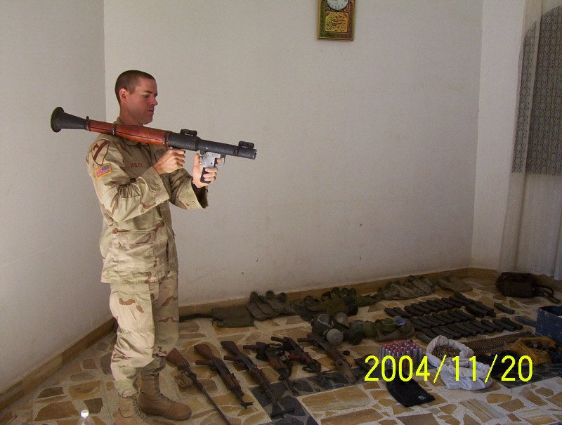 Enemy weapons cache discovered. Hank is checking out a captured Iraqi RPG launcher